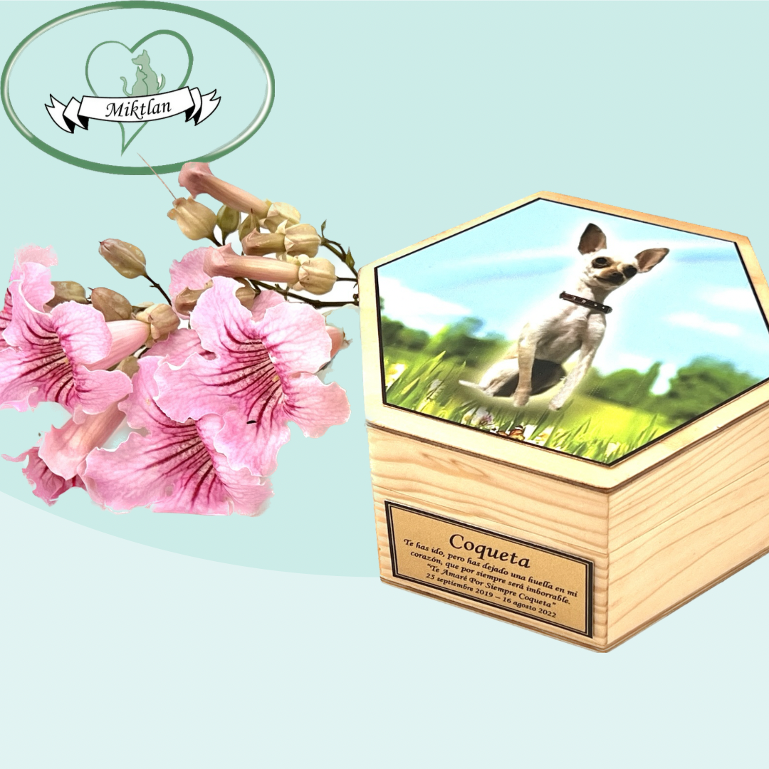 Hermosa urna de madera pino, con una fotografía la cual es impresa en una placa de aluminio, ademas en la parte de enfrente se incluye una placa de aluminio con el nombre y la fecha.